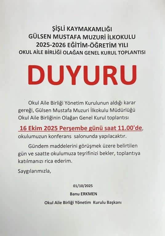 2025/2026 Okul Aile Birliği Olağan Genel Kurul Toplantı Duyurusu